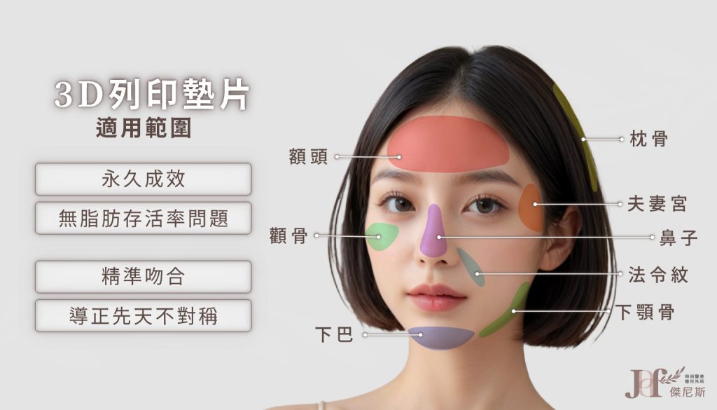 3D列印墊片是根據電腦斷層掃描後訂製的植入物,能像樂高積木一樣精準吻合面部骨相,並大幅降低植入物移位,減少植入物與骨骼的空隙(deadspace,俗稱死區),與攣縮的可能性。