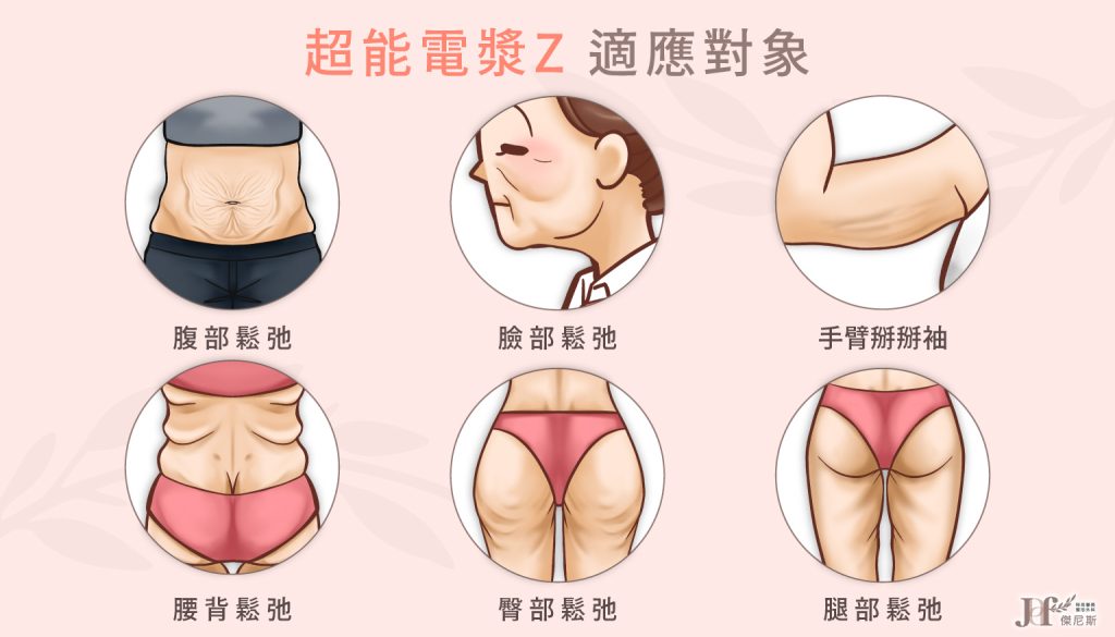 治療範圍廣泛,能夠適應全身皮膚鬆弛部位,尤其適合生產後的婦女及減重後皮膚鬆弛者,一次可治療多個部位。身體局部多餘脂肪堆積者,常合併抽脂治療。身體大幅抽脂後,易產生肌膚鬆弛與凹凸不平之情況,搭配「超能電漿Z」可大幅增加肌膚緊緻程度,減少橘皮組織的產生。