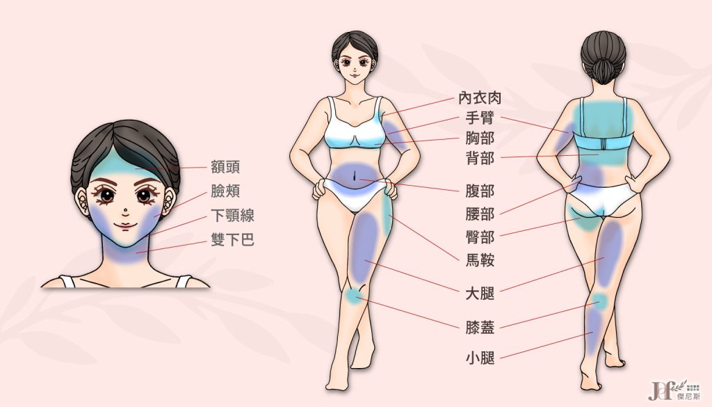身體:腹部、腰部、胸部、副乳(內衣肉)、背部、手臂(掰掰袖)、臀部、馬鞍、大腿、膝蓋、小腿